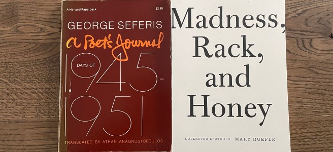 Then last Monday, in the Oxfam bookshop at Ealing Broadway, I found a copy of ‘Madness, Rack, and Honey – collected lectures’ by the American poet Mary Ruefle. I recognised one of the chapters from Poetry magazine some years ago. The chapter headings are intriguing; ‘Someone reading a book is a sign of order in the world’, ‘I remember, I remember’, ‘Lectures I will never give’. Her method is to accumulate short sections; a sentence or two, a paragraph, a list, a quotation. And one of the short sections of ‘Someone reading a book…’ is about reading the notebooks of George Seferis, and copying out her favourite passage.